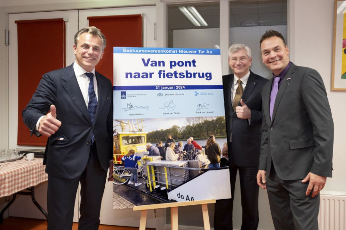 Minister Mark Harbers van Infrastructuur en Waterstaat, gedeputeerde André van Schie van de provincie Utrecht en wethouder Frank van Liempdt van de gemeente Stichtse Vecht ondertekenden de overeenkomst in het dorpshuis in Nieuwer Ter Aa. Langere tijd is gesproken over de nautische veiligheidsrisico’s van de pont op het kanaal. In december 2022 werd duidelijk dat de partijen het eens geworden waren over een vervangende fietsbrug. Er is toen ook afgesproken dat onderzoeksinstituut MARIN zou kijken welke extra maatregelen genomen kunnen worden zodat de pont veilig in de vaart kan blijven tot de fietsbrug er is. Het afgelopen jaar heeft MARIN het onderzoek uitgevoerd en is de overeenkomst over de aanleg van de fietsbrug in goed overleg in detail uitgewerkt.